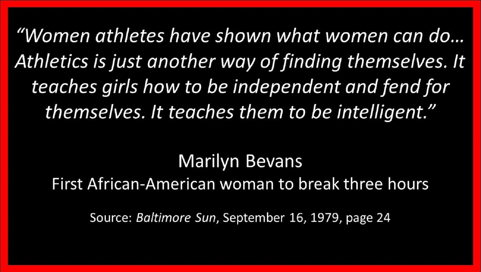 In a March 1, 2013 email, a writer asked for assistance in locating marathoner Marilyn Bevans to include in his upcoming book. A vast majority of runners had never heard of her. Her lack of recognition, as well of those of other African American distance runners, led to the formation of the National Black Distance Running Hall of Fame where she was inducted into the initial class in 2013 along with Ted Corbitt.